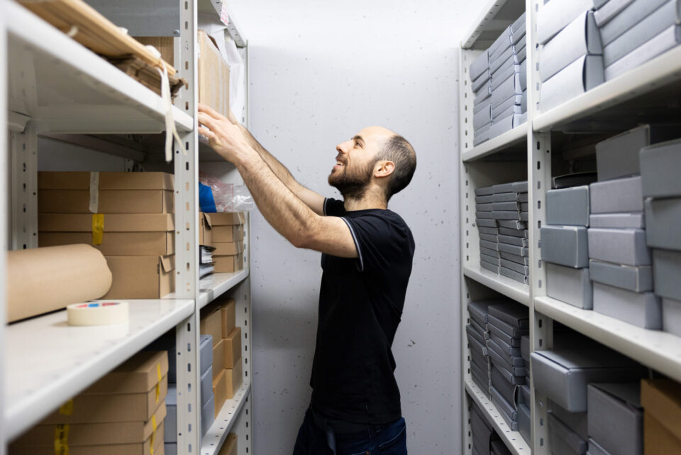 Michel Nader organises materials in the Nokia Design Archive, where researchers, students and fans can explore original designs. If anyone wants to access the archive, “they can easily send an email,” he says. “This is open, and then they can see it.”Photo: Emilia Kangasluoma